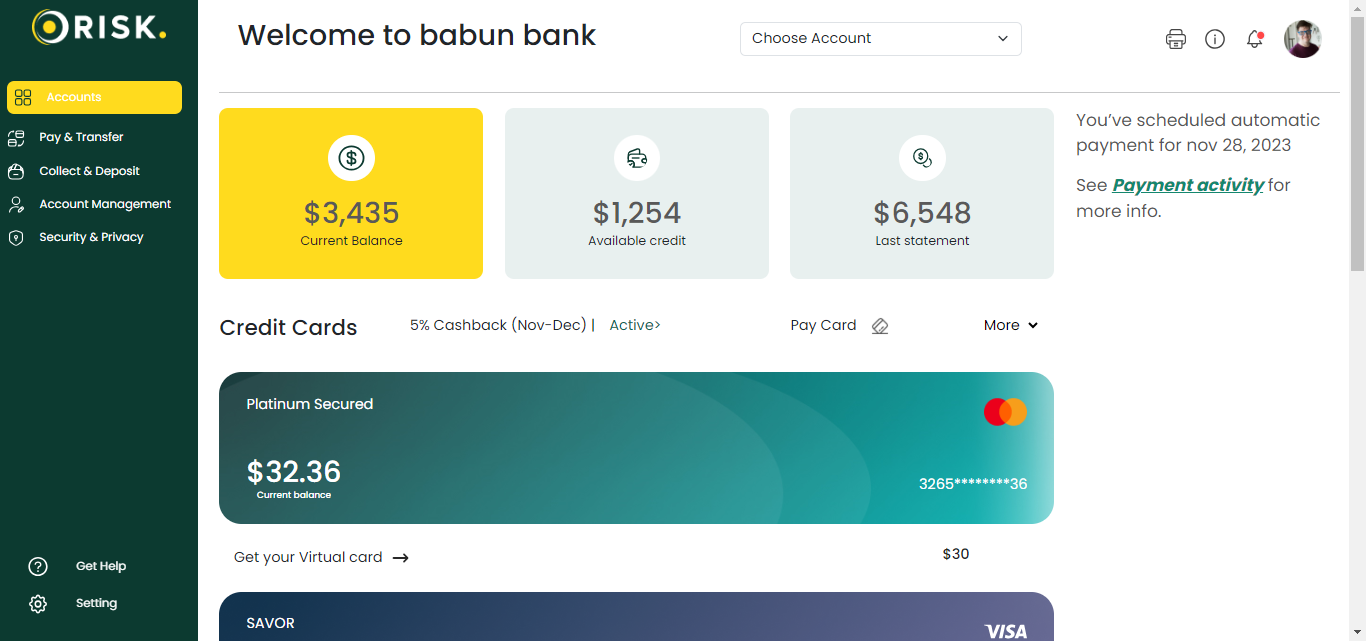 A modern template designed of admin. Features include Pay & Transfer , Collect & Deposit, Account management, Security and a clean layout.
